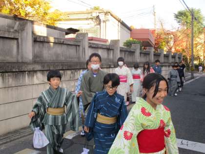 きもの着付け実習の様子です。一人一人が着物を着て洋服との違いを実感しました。また、着物の歴史や出来上がるまでの過程を教えてもらいました。着物を着て、地域も歩きました。充実した時間になりました。