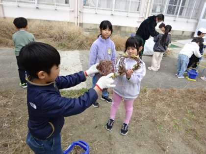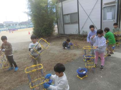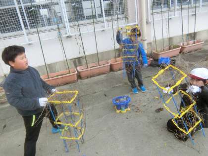 春から大切に育ててきたあさがおを、リースの形にしました。つるが支柱にからまっているのを丁寧に外していきました。春から、リースを作ること楽しみに育ててきたので、うれしそうに活動しました。