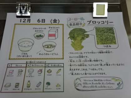 今日の献立は、「ごはん(京北米)・牛乳・和風カレーどうふ・ブロッコリーのおかか煮」でした。今日のごはんは、京北地域で作られたお米が使われていました。今日も美味しい給食、ごちそうさまでした!