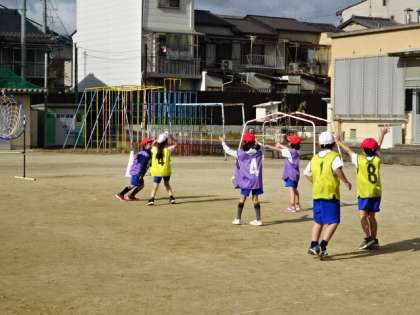 「パスゲーム」の学習です。暖かい日差しのもとで、お互いに声をかけあいながら、元気にプレーしています。