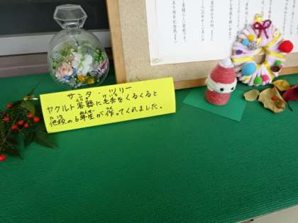 12月と言えば、「クリスマス」。職員室前には、クリスマスちなんだものが飾られています。サンタクロースには、みんな、どんなことをお願いしているのでしょうね。