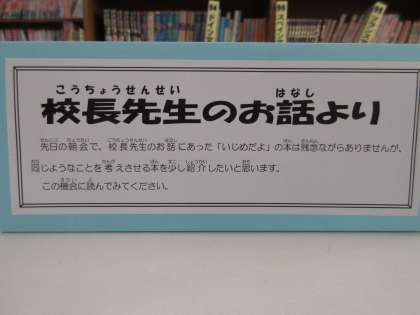 人権朝会で「いじめだよ!」の絵本を紹介し、全校で人権について考えました。図書館の学校司書の先生が、関連した本を紹介してくれています。ぜひこの機会に読んで、人権についてまた考えられるといいですね。
