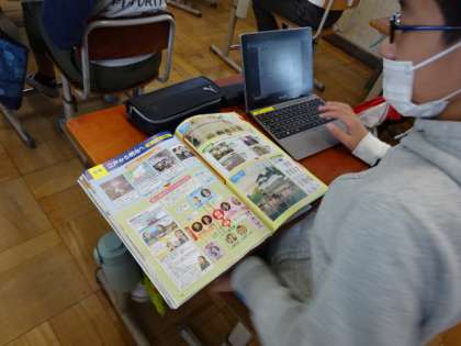 歴史学習を進めています。教科書や資料集、また、タブレットを使って当時の様子を調べ、自分なりにまとめながら学習を進めています。