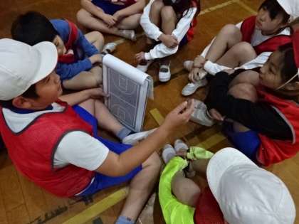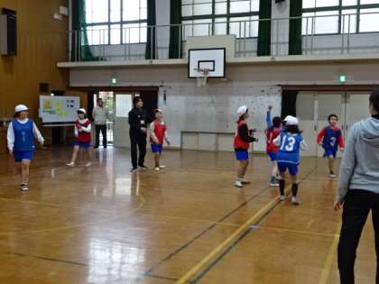 バスケットボールの学習をしています。チームの時間には、作戦を相談したり、連携を確認したりして、チームの力を高めようとしています。