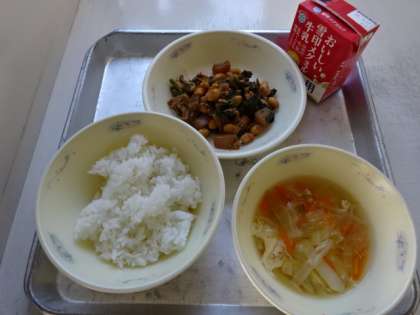 今日の献立は、「ごはん・牛乳・肉みそいため・キャベツのかきたま汁」でした。肉みそいためは、味噌の香りやコクを味わいながらいただきました。今日も美味しい給食、ごちそうさまでした!