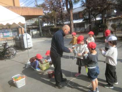 今日はコマ回しに挑戦しました。ひもの巻き方や、こまの投げ方を校内の先生に教えてもらいながら、取り組みました。こまが回ると、大喜びの子どもたちでした。