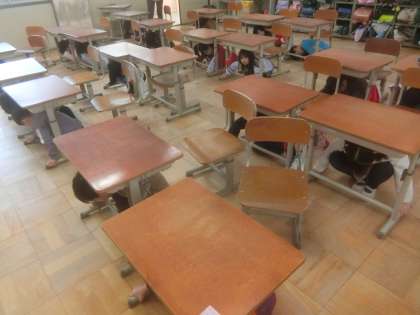 今日の安全学習は、地震の避難訓練を行いました。事前に、地震が起こった時の対応をみんなで考えていたので、訓練がはじまると熱心に取り組みました。机の脚をしっかり握りしめて、頭を守りました。