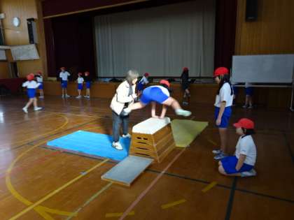 とび箱運動の学習です。自分が挑戦する技に果敢に挑戦しています。先生にも補助してもらいながら、技ができるように、みんな頑張っています。