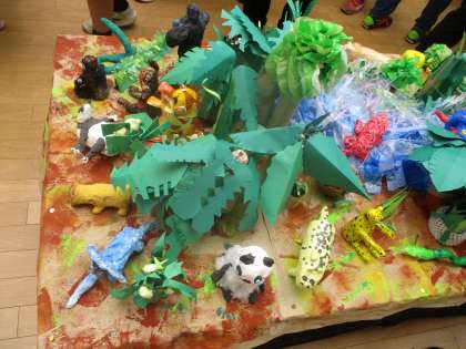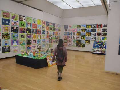 本日、朱雀第四小学校の育成学級の友だちと一緒に鑑賞しました。自分の作品が展示されているのを見つけると、嬉しそうにしていました。中京支部のみんなで共同制作した作品もあり、目を見張る作品がたくさんありました。