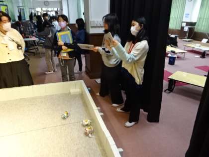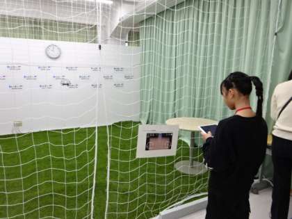 展示ブースを回るグループは、最先端の技術に触れて、未来の商品を開発するミッションに取り組みます。ドローン、AIロボ、月面探索ロボなどを体験しました。