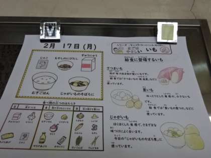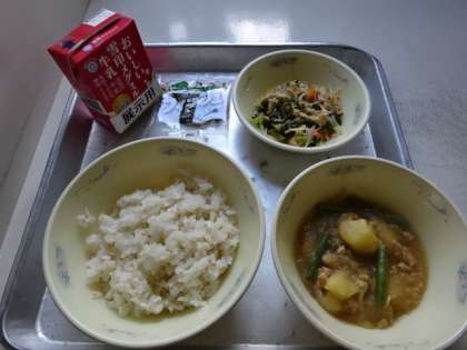 今日の献立は、「麦ごはん・牛乳・じゃがいものそぼろ煮・もやしの煮びたし・じゃこ」でした。ほくほくとした食感を味わうことができるじゃがいものそぼろ煮は、体が温まります。今日も美味しい給食、ごちそうさまでした!