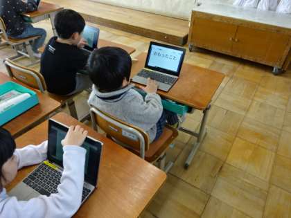 一年生を振り返り、思い出をタブレットを使ってまとめました。入学してからの一年間で、たくさんの思い出とともに、できることもたくさん増えた1年生です。