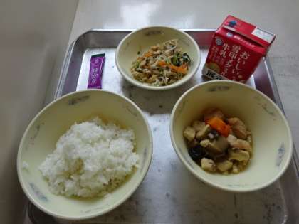 今日の献立は、「ごはん・牛乳・高野どうふと野菜のたき合わせ・もやしの煮びたし・ふりかけ」でした。今日はふりかけもついていたので、いつも以上に食がすすみます。今日も美味しい給食、ごちそうさまでした!