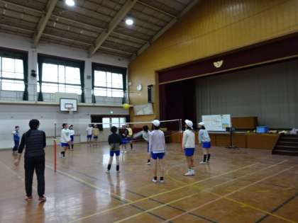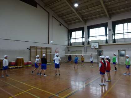 ソフトバレーボールの学習です。ボールのコントロールが難しいですが、易しいルールに変更しながら、みんなで声をかけ合ってプレーを楽しんでいます。