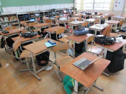 訓練では机の下に頭と体をうまく隠すことができました。ご家庭でも非常事態について、ぜひ話してみてください。