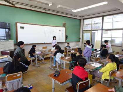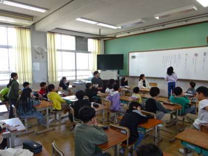 4年生は、議長団を構成して学級会を開き、学級目標についてみんなで話し合いました。先生にも導いてもらいながら、みんなで話し合いを進めています。