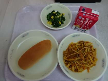 今日の献立は、「小型コッペパン・牛乳・スパゲティのミートソース煮・ほうれん草のソテー」でした。給食室も春らしい装いで、みんながやってくるのを心待ちにしていました。今年も毎日の給食が楽しみです。今年もよろしくお願いします。そして、美味しい給食、ごちそうさまでした!