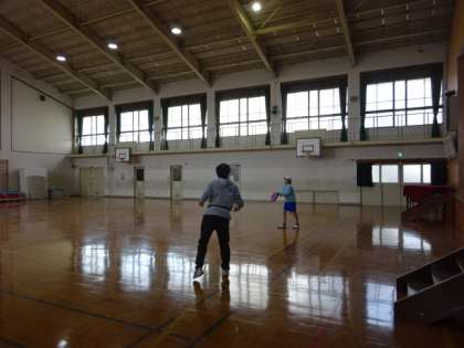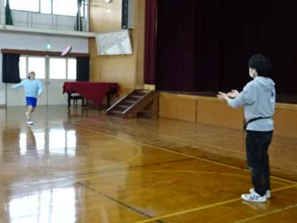 体育館で先生と一緒に体を動かしました。フリスビーはねらったところにお互いに投げることができるか、頑張って挑戦していました。