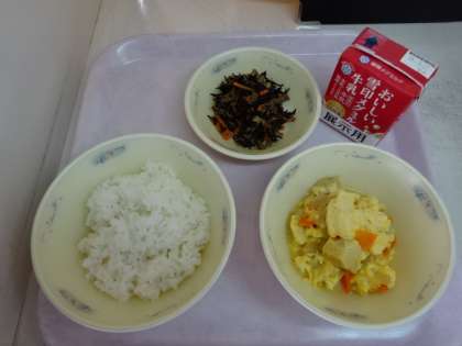 今日の献立は、「ごはん・牛乳・高野どうふの卵とじ・ひじきの煮つけ」でした。高野どうふにだし汁や具材のうま味がしみ、ごはんもすすみます。今日も美味しい給食、ごちそうさまでした!