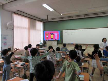 今日の音楽の学習のめあては、「きょくにあわせて、うたっておどろう」です。曲を聞き、リズムを合わせて体を動かしました。そして、授業の最後には6年生が教室に来てくれて、いっしょに歌を歌いました。1年生は、きれいな声の出し方を教えてもらい、今日できれいな歌声を出せるようになりました。