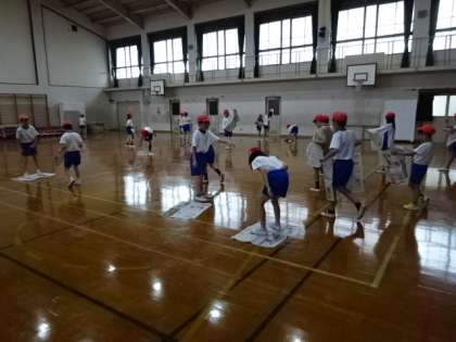 体ほぐしの運動で、体を動かしながら友だちと楽しいひと時を過ごしました。新聞紙を使った遊びでは、新聞紙の上から落ちないように工夫し、勝負を楽しんでいました。