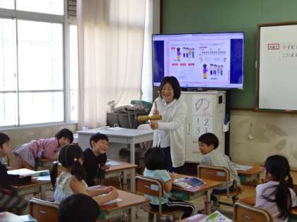 音楽の時間の様子です。先生がたたくリズムにあわせて、自分の好きなものを紹介します。少し照れくさそうにしながら、リズムに合わせて楽しそうに答えていました。