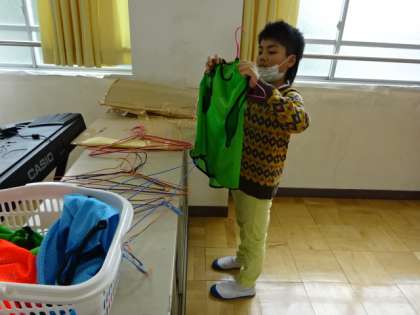 今日は、今度の全校遠足で使うビブスを洗濯です。きれいに形を整えてハンガーで干しています。みんなのために頑張っています。