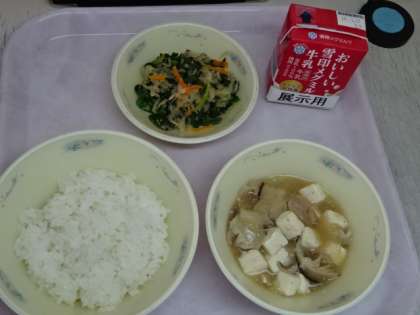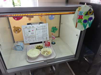 今日の献立は、「ごはん・牛乳・豚肉ととうふのくず煮・ほうれん草と切干大根のごま煮」でした。5月の給食目標は、「当番や係は はやく上手にしよう」です。献立カレンダーには、上手に配るポイントも示されていて、みんなで協力して用意を進めています。今日も美味しい給食、ごちそうさまでした!