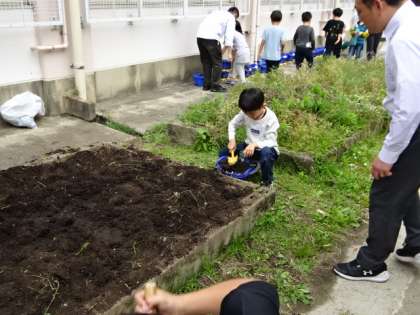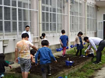ミニトマトを育てていく2年生。今日はみんなで土づくりをしました。心を込めてこれから大切に育てていきます。