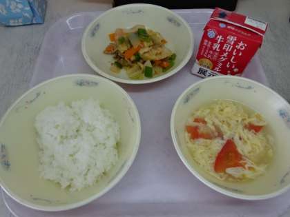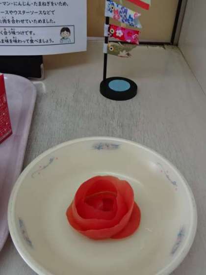 今日の献立は、「ごはん・牛乳・豚肉とキャベツのソースいため・トマトと卵のスープ」でした。展示食のとなりには、トマトの皮で作られたお花が一緒に添えられていて、みんな大喜びでした。今日も美味しい給食、ごちそうさまでした!