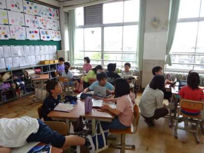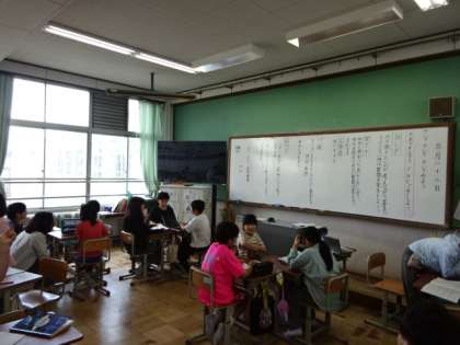 「きいて きいて きいてみよう」の学習です。「話し手」「聞き手」「記録者」の役割でインタビューを進めていきます。めあてをしっかり立てたうえでインタビューにのぞんでいました。