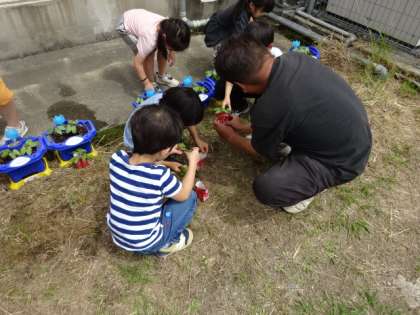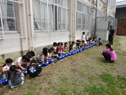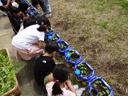 アサガオの種をまいてから数日が経ち、芽が出てきました。今日は外に出てきて、みんなで間引きをしました。間引いた芽は後日持ち帰るので、家でもアサガオの花を咲かせることができるといいですね。