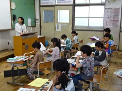 音楽の学習の様子です。鍵盤ハーモニカで演奏です。伸ばす音、休む時などを考えて、リズムよく演奏できるように練習しています。