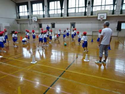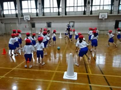 体育館でころがしドッジボールをして、みんなで楽しいひと時を過ごしました。転がってくるボールから必死に逃げる1年生。ほのぼのとします。