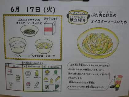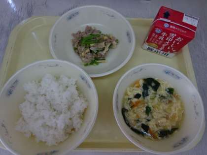今日の献立は、「ごはん・牛乳・豚肉と野菜のオイスターソースいため・中華コーンスープ」でした。オイスターソースの味で、ごはんもよくすすみます。今日も美味しい給食、ごちそうさまでした!