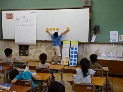 たし算の学習が始まりました。数図ブロックを使って、たし算の意味を確認しながら学習を進めています。黒板用の大きな数図ブロックも、手をいっぱいに広げて動かしています。