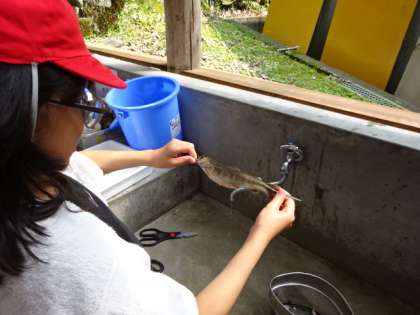野外炊事がスタートです。捕まえた魚は、さばいて串にさして塩焼きにします。あと、お鍋でご飯を炊き、豚汁を作ります。