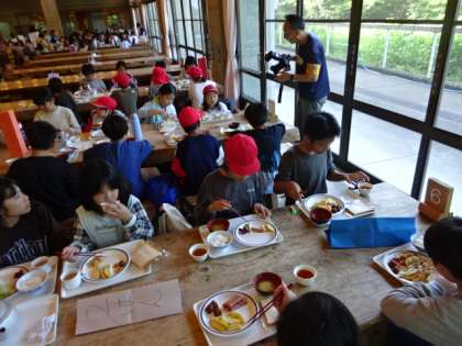 朝食は食堂でいただきました。眠そうにしていた子たちも、朝食をいただき元気が出てきました。この後、スコアオリエンテーリングの活動に入ります。