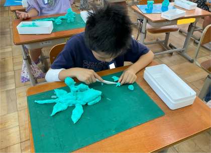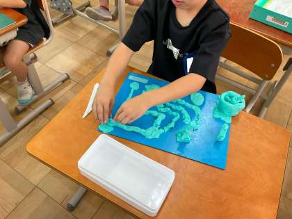 「だれと散歩に行きたいか」「どこに行きたいか」「何をしながら散歩をするのか」を考えながら、思い思いのイメージをねんどで形にしていきました。ねんどをちぎったり、つまんだりしながら、自分の作りたい大きさや形に工夫して取り組む姿が見られました。