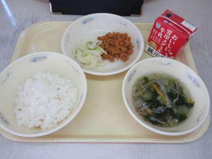 今日の献立は「ごはん・牛乳・タコライス風(具)・スープ」でした。新献立のタコライス風(具)をご飯の上に乗せごはんと一緒に食べました。ニンニクを香ばしく炒め、カレー味がアクセントになりスパイシーな味付けとなっています。今日も美味しい給食、ごちそうさまでした!