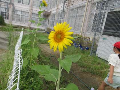 1年生が6月に植えたひまわり。夏の暑さに負けず、ぐんぐんと大きくなったひまわりが咲きました。まだまだ暑い日が続きますが、水分補給をしっかりしてがんばろうね。