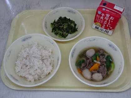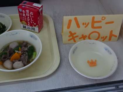 今日の献立は、「麦ごはん・牛乳・いも煮・だいこん葉とじゃこのいためもの」でした。いも煮は山形県の郷土料理でした。そして、そのいも煮にはハッピーキャロットが入っていました。今日も美味しい給食、ごちそうさまでした!