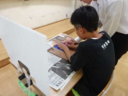 2学期は版画に取り組みます。作品作りに向けて、今日は彫刻刀の使い方を確認しました。昨年度の経験を思い出しながら、安全に扱うことを確認しました。