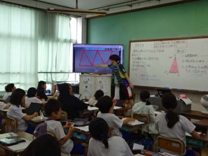 三角形の3つの角の和がどうなっているのか、いろいろな方法で調べました。タブレットを活用する、分度器で調べる、三角形を切って調べるなど、いろいろな方法で調べ、きまりを見つけ出していました。