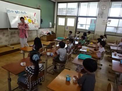 1年生の子どもたちを対象に、歯科衛生士さんをお招きして「歯みがき指導」を行いました。歯の大切さや、虫歯を防ぐための正しい歯みがきの方法について、わかりやすく教えていただきました。