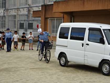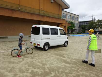 最初、交通課の方から、安全な自転車の乗り方についてお話があり、次に自転車の運転の実技に入ります。運動場に道路や横断歩道をみたててひかれた白線にそって、信号、駐車された自動車などに注意して自転車を運転します。安全確認が大切であることをあらためてかくにんすることができました。