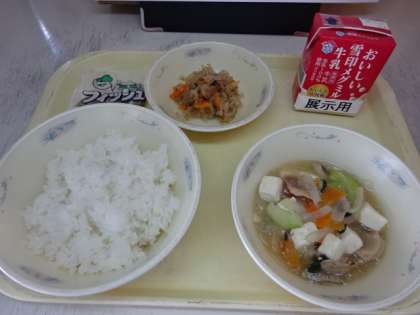 今日の献立は、「ごはん・牛乳・豚肉ととうふのくず煮・切干大根の三杯酢・じゃこ」でした。全校練習を終えた後の給食を、みんなしっかりといただいていました。今日も美味しい給食、ごちそうさまでした!