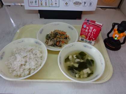 今日の献立は、「麦ごはん・牛乳・豚肉のチャプチェ・わかめスープ」でした。豚肉のチャプチェは人気のメニューです。今日も美味しい給食、ごちそうさまでした!