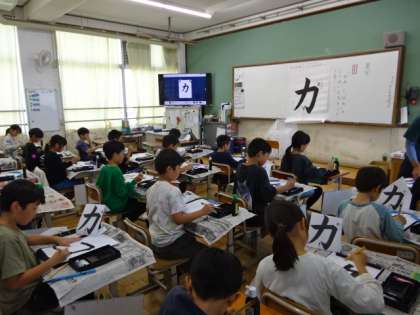 今回は「力」を習字で書きました。「まがり」や「はね」、「はらい」に気をつけながらも、力強く筆を動かしていました。