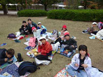 お昼のお弁当は、1・2年生一緒にたてわりグループでいただきました。お家の方に用意してもらったお弁当を嬉しそうに頬張っていました。朝早くからのお弁当のご準備、ありがとうございました。今日見つけたものは持ち帰っていますので、お家でも秋のお話、いっぱい聞いてもらえたらと思います。